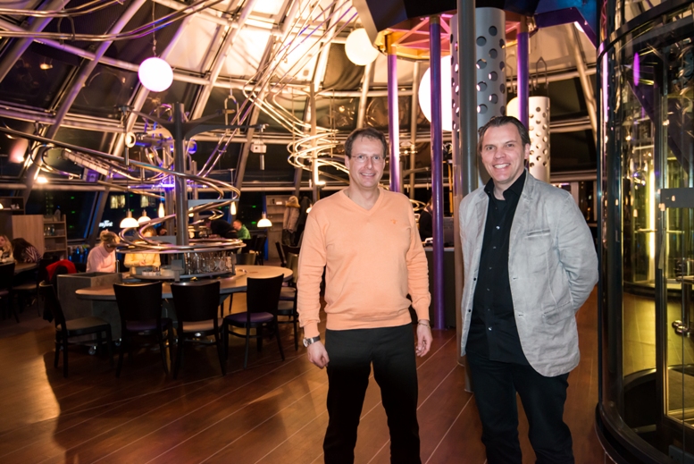 De uitvinder van de achtbaanrestaurants de heer Michael Mack (r) en de heer Christian Steinbach, directeur van de achtbaanrestaurants in Hamburg en Dresden.