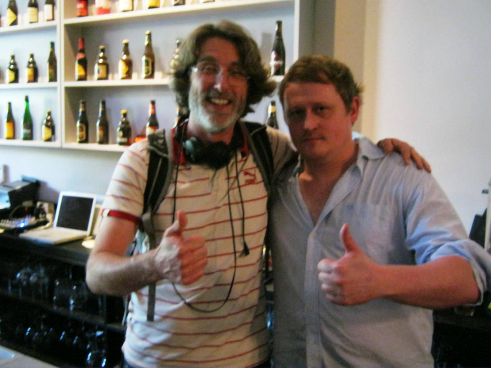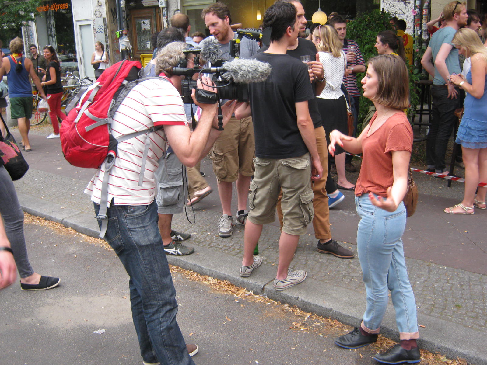 Bij bar Herman liep ik freelance cameraman Nikolai Singer tegen het lijf. Hij maakt een reportage over de diverse locaties in Berlijn waar mensen de voetbalwedstrijden volgen en houdt ook korte interviews met de bezoekers. Zodra die film af is, zal ik er op dit blog over berichten. Hieronder enkele foto’s van gisteravond.
