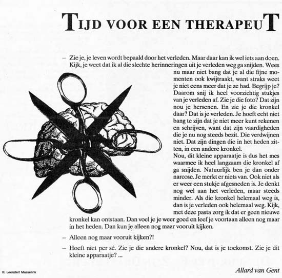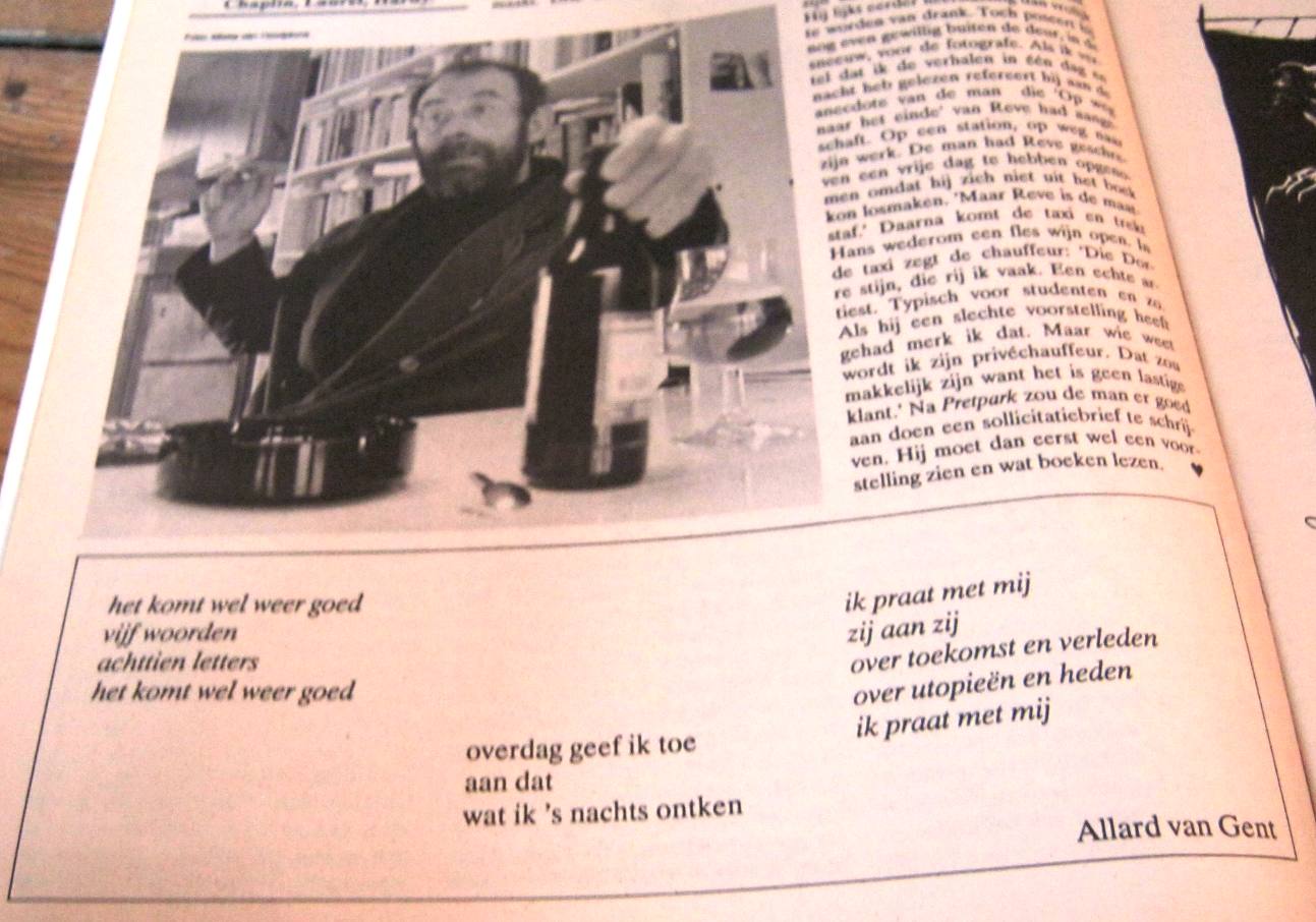 In uitgave 44 las ik wederom mijn naam, nu onder de dialoog Tijd voor een therapeut. De uitgave daarop verscheen mijn eerste gedichtje onder een pseudoniem. Ik herinner me dat ik als altijd een bewijsexemplaar kreeg toegestuurd maar dat ik mijn naam nergens kon vinden. Totdat ik me herinnerde dat ik als afwasser in hotel Krasnapolsky ooit een keer een gedicht had geschreven onder de naam A.F. Wasser (afwasser) en naar het blad opstuurde. Op een hele pagina stond naast een illustratie van Elna Obreen de volgende tekst: