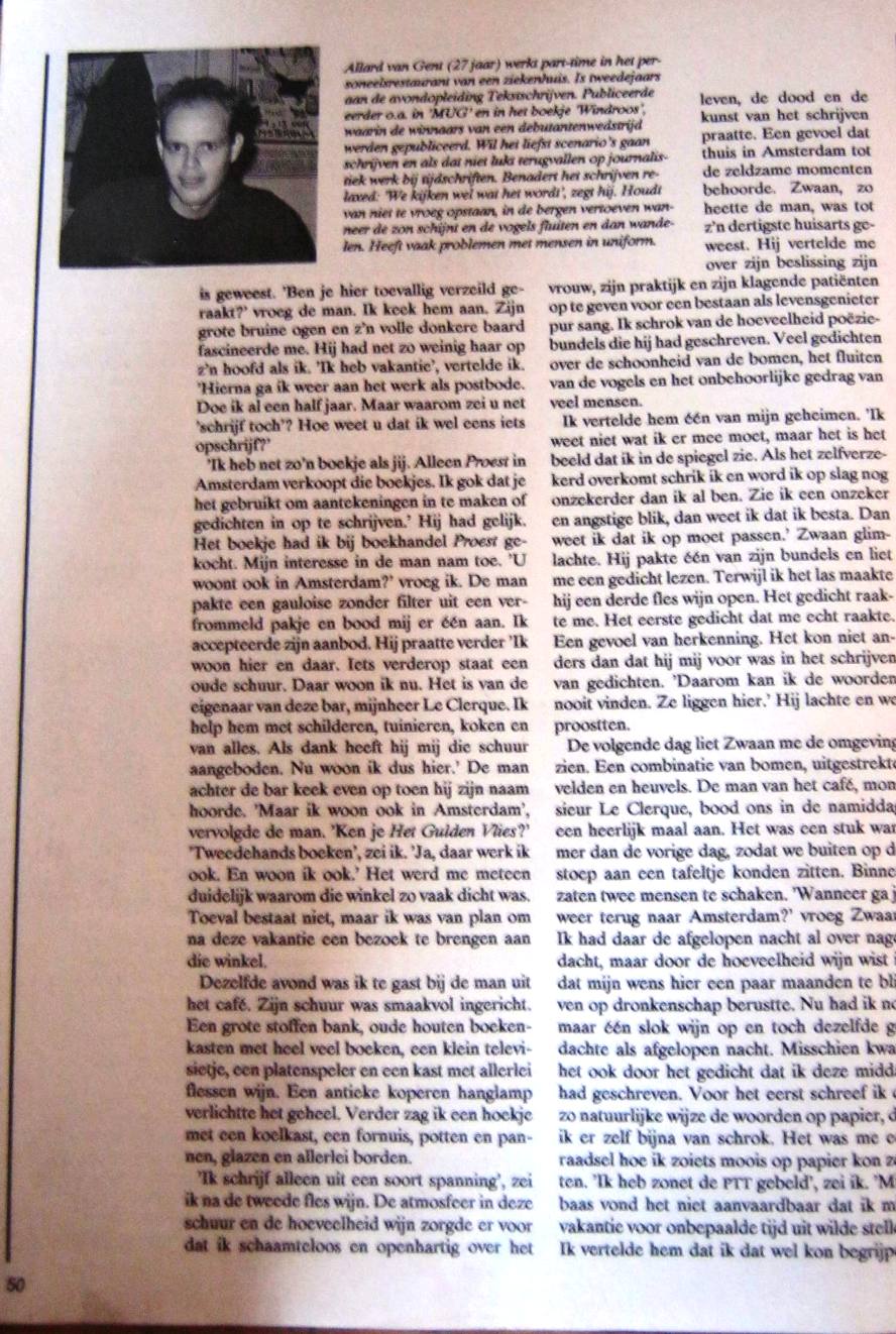 Natuurlijk was het moeilijk dit gedicht te promoten, want niemand wist dat ik in de huid van de niet bestaande Adriaan Ferdinandus Wasser was gekropen. Na dit gedicht volgde in het voorjaar van 1996, vlak voordat ik naar Mallorca vertrok en me aan het maken van een eigen maandblad wijdde, mijn laatste bijdrage in Mens & Gevoelens.