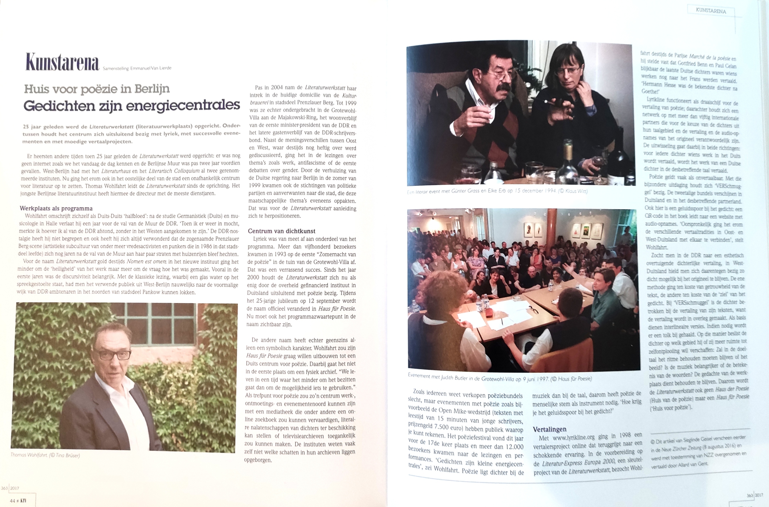 Er heersten andere tijden toen 25 jaar geleden de Literaturwerkstatt werd opgericht: er was nog geen internet zoals we het vandaag de dag kennen en de Berlijnse Muur was pas twee jaar voordien gevalen. West-Berlijn had met het Literaturhaus en het Literarisch Colloquium al twee gerenommeerde instituten. Nu ging het erom ook in het oostelijke deel van de stad een onafhankelijk centrum voor literatuur op te zetten. Thomas Wohlfahrt leidt de Literaturwerkstatt sinds de oprichting. Het jongste Berlijnse literatuurinstituut heeft hiermee de directeur met de meeste dienstjaren.