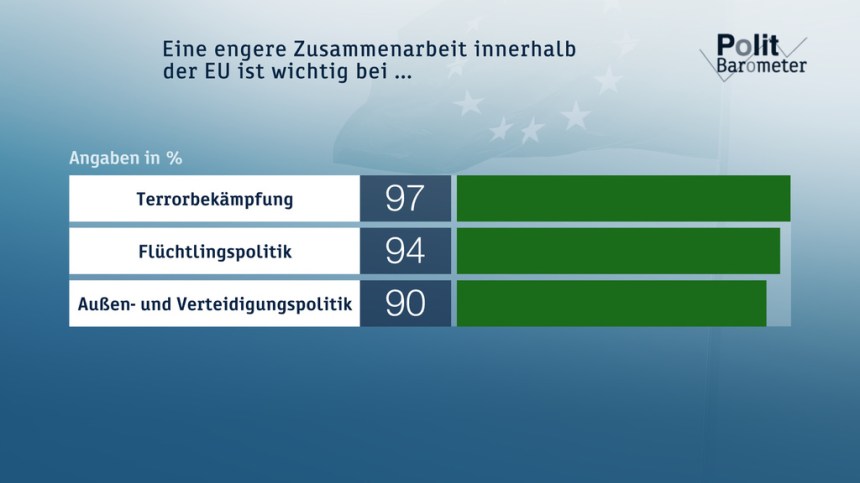 Een zeer grote meerderheid van de geënquêteerden is voor een intensieve samenwerking van de Europese landen. Volgens de laatste enquête vindt maar liefst 97 procent een nauwere samenwerking bij terrorismebestrijding belangrijk (niet belangrijk: twee procent), 94 procent vindt dat ook bij het vluchtelingenbeleid (niet belangrijk: vier procent) en 90 procent bij het veiligheidsbeleid en de buitenlandse politiek (niet belangrijk: negen procent).