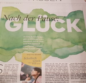 Het Duitse dagblad Welt am Sonntag besteedde vandaag uitgebreid aandacht aan dit onderwerp. Op de vraag “wat is geluk” wisten de leerlingen van de Jean-Kramer-Schule in Berlijn wel een antwoord: “dürüm döner met salade” of “slagen voor het eindexamen” of “als er in mijn land geen oorlog meer is”. De antwoorden staan geschreven op bontgekleurde post-its die op de vloer van het klaslokaal zijn vastgeplakt. Naast Duits, wiskunde en sport leren de kinderen hier iets waar ze in geen ander vak mee te maken krijgen: zichzelf leren kennen.