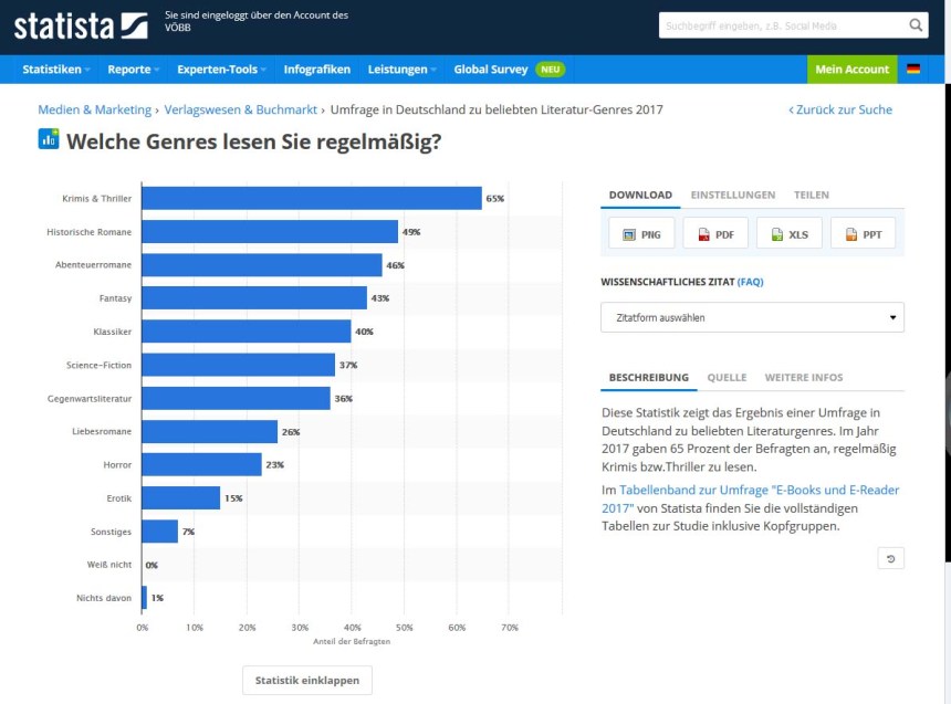 Natuurlijk neem ik meteen de proef op de som. Al snel merk ik dat zo’n database met zoekfunctie een verslavende werking kan hebben bij nieuwsgierige mensen zoals ik. Als boekenliefhebber wil ik weten welk genre boeken de Duitser regelmatig leest. Na een paar muisklikken heb ik een uitgebreid antwoord op mijn beeldscherm. Met 65% staat het genre detectives&thrillers op de eerste plaats, gevolgd door historische romans (49%), avonturenromans (46%) en fantasy (43%).