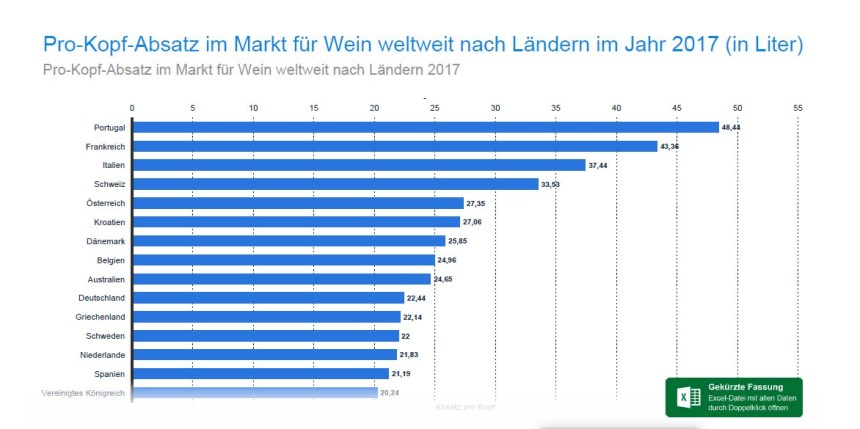 In welk land op de wereld wordt de meeste wijn gedronken en op welke plaatsen staan Nederland, België en Duitsland? Dat lijkt me een leuke afsluiter voor mijn eerste kennismaking met Statista. Op de eerste plaats staat Portugal. In dat land dronk men in 2017 per inwoner 48,44 liter wijn. Op nummer twee staat Frankrijk met 43,36 liter en Italië neemt met 37,44 liter per persoon de derde plaats in. België staat met 24,96 liter p.p. op de achtste plaats, Duitsland met 22,44 liter op nummer tien en Nederland met 21,83 liter op de dertiende plek. Tot zover mijn eerste eerste ervaringen met Statista, proost!