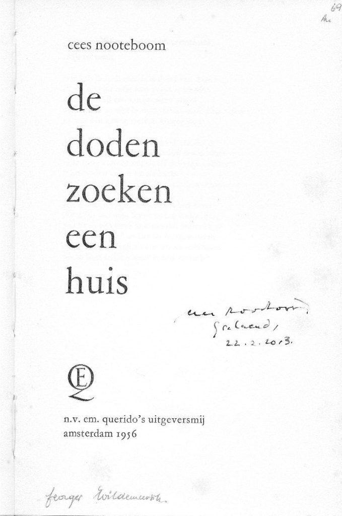 De tweede keer was ook in 2013. Dit keer niet in Berlijn, maar in Gschwend. De schrijver was verrast dat er een Nederlander opdook in dit dorpje in Baden-Würtemmberg én dat de man zijn eerste gedichtenbundel De doden zoeken een huis (1956) op zak had. Ik vroeg of hij het wilde signeren. Het dunne boekje kocht ik destijds bij de Slegte in Antwerpen, het was het allerlaatste gebruikte exemplaar.‘Dat is ook een bekende essayist’, zei Nooteboom. ‘Leeft hij nog?’