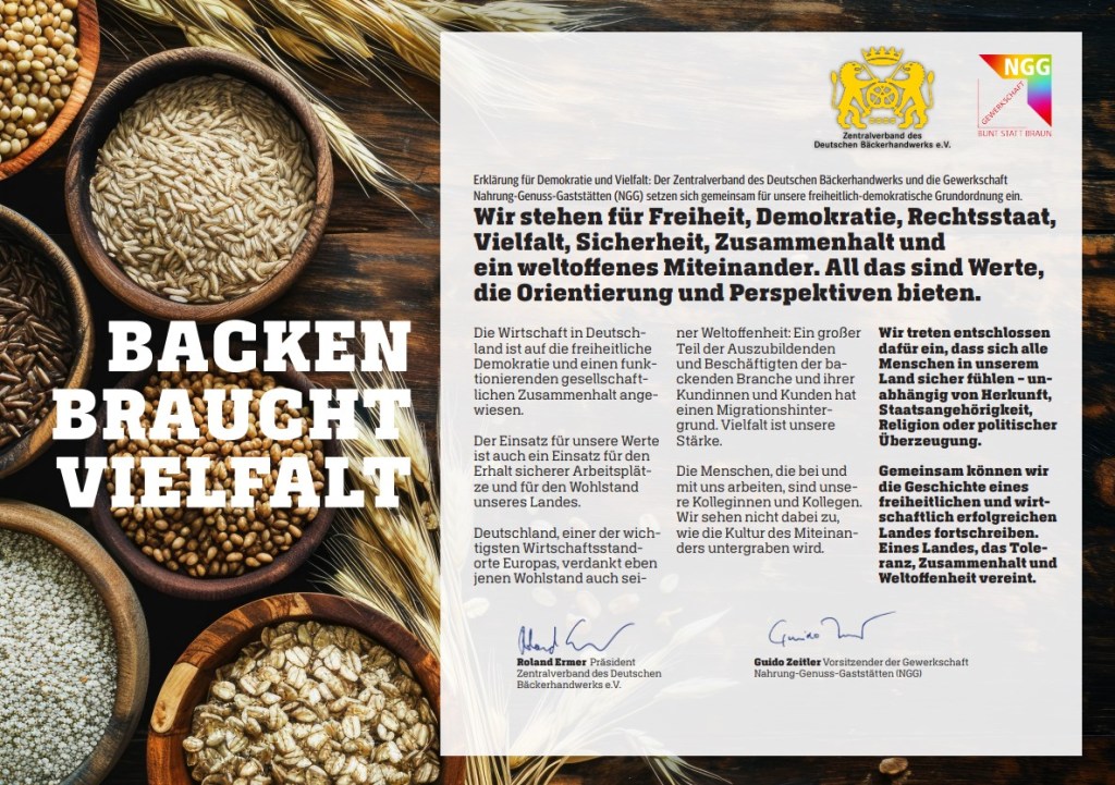 Verklaring voor democratie en diversiteit: het Zentralverband des Deutschen Bäckerhandwerks (ZDB) en de Gewerkschaft Nahrung-Genuss-Gaststätten (NGG) zetten zich gezamenlijk in voor onze “freiheitlich-demokratische Grundordnung”*. Wij staan voor vrijheid, democratie, rechtsstaat, diversiteit, veiligheid, verbondenheid en een internationaal ingesteld samenleven. Dit zijn allemaal waarden die houvast en perspectieven bieden.