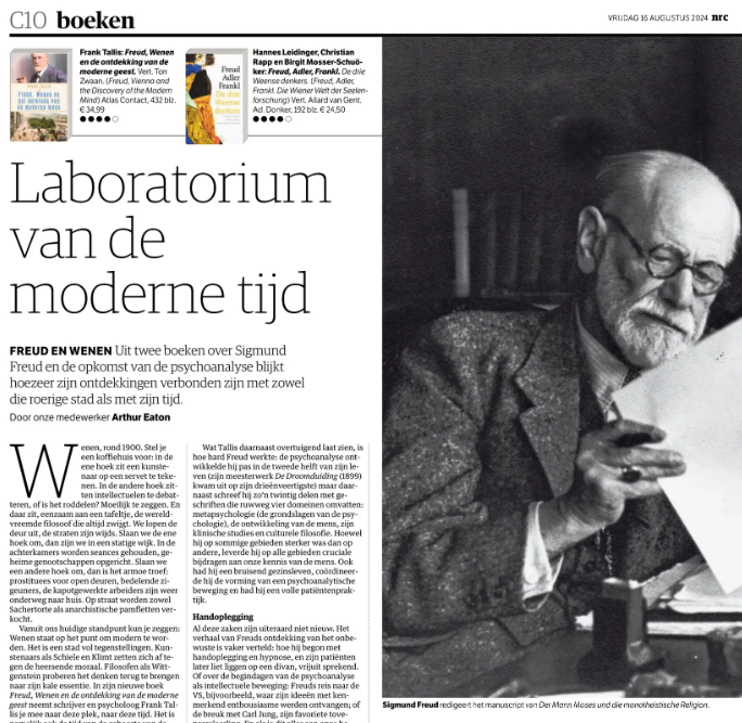 In de NRC staat o.a. het volgende: “Voor wie meer wil weten over hoe de psychoanalyse zich ontwikkelde kort na Freuds tijd is er een nieuw boek: Freud, Adler, Frankl, waarin naast Freud twee andere therapeuten worden besproken. Dit boek, geschreven door drie verschillende auteurs, Hannes Leidinger, Christian Rapp en Birgit Mosser-Schuöker, speelt zich net als Tallis’ boek af tegen het veranderende decor van Wenen. Adler was een socialist en een naaste medewerker van Freud. Hij was een voorvechter van vrouwenrechten en pleitte voor psychoanalyse voor de gewone man. Hoewel Adlers theorieën minder invloedrijk waren dan die van Freud, introduceerde hij bijvoorbeeld het concept van het minderwaardigheidscomplex. Viktor Frankl, de publieksfavoriet, was een Oostenrijkse psychiater en Holocaust-overlevende die de ‘logotherapie’ bedacht, een vorm van existentiële analyse gericht op het vinden van betekenis in het leven. In zijn bekende boek De zin van het bestaan, nog altijd een bestseller, reflecteert hij op zijn ervaringen in concentratiekampen en onderzoekt hij hoe het nastreven van een doel mensen kan helpen om te gaan met tegenslagen en die te boven te komen.” Met Tallis’ boek wordt het boek Freud, Wenen en de ontdekking van de moderne geest van Frank Tallis bedoeld. De vertaling van dat werk was in handen van Ton Zwaan.