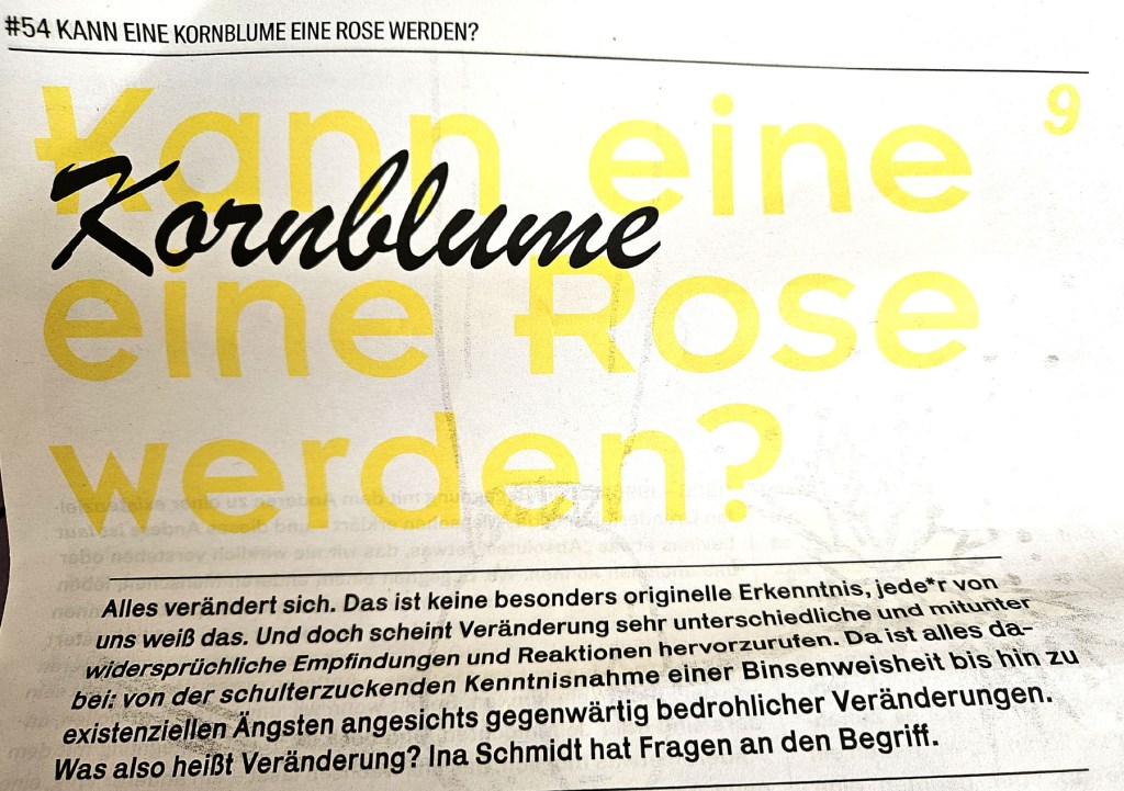 Kan een korenbloem een roos worden? Zo luidt de titel van de bovengenoemde bijdrage. In dat stuk gaat het om de vraag wat verandering precies is en wat voor verandering mensen vandaag de dag voor ogen hebben. Het eindigt met de interessante vraag of we een andere weg in willen slaan als we het perspectief van een wenselijke toekomst hebben verloren. Volgens Hanna Arendt (1906 – 1975) zijn we zeer goed in staat andere perspectieven te kiezen – we hebben alleen de moed daartoe nodig.