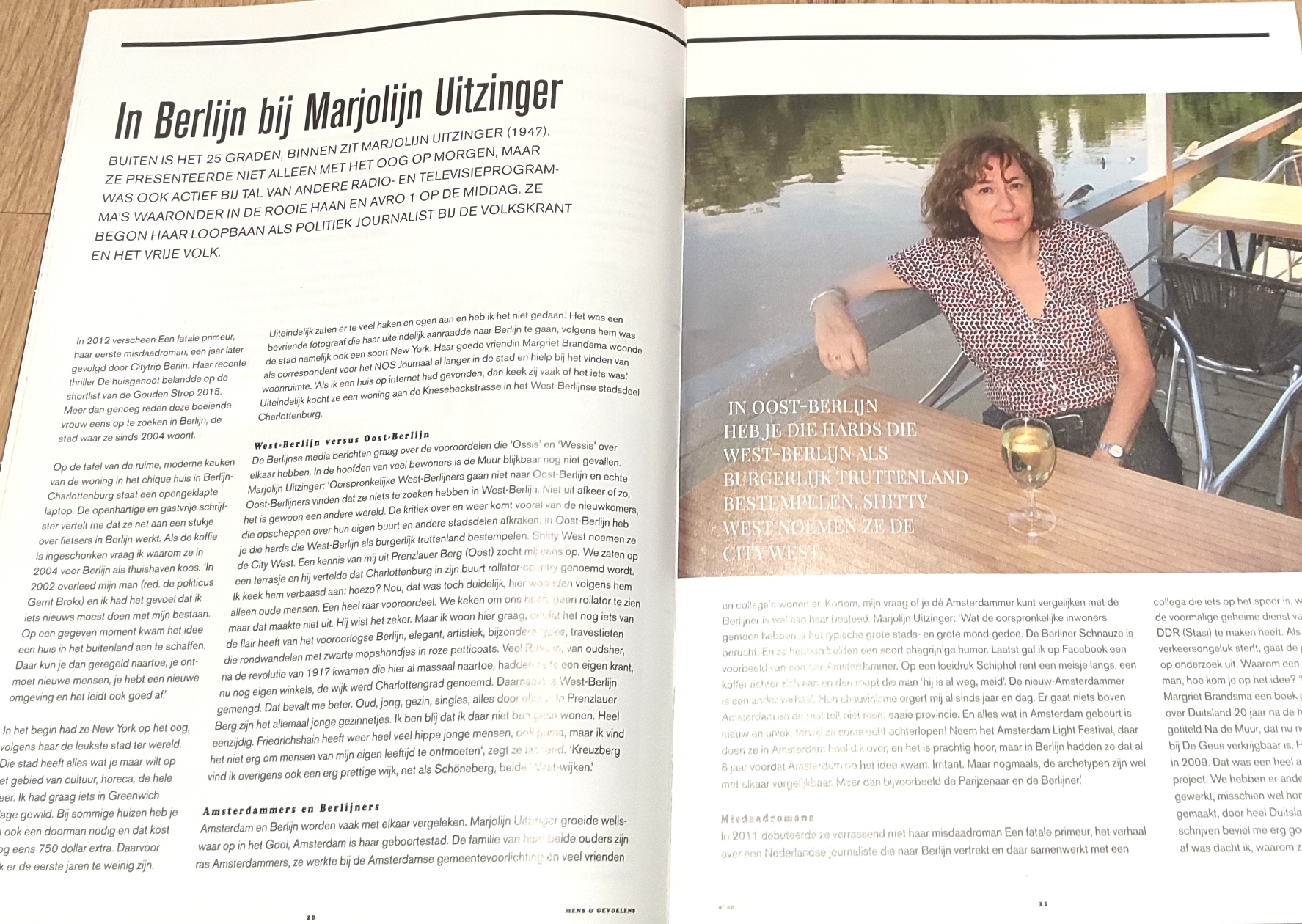 Buiten is het 25 graden, binnen zit Marjolijn Uitzinger (1947). Ze presenteerde niet alleen Met Het Oog Op Morgen, maar was ook actief bij tal van andere radio- en televisieprogramma’s waaronder In de Rooie Haan en AVRO 1 op de Middag. Ze begon haar loopbaan als politiek journalist bij de Volkskrant en het Vrije Volk. In 2012 verscheen Een fatale primeur, haar eerste misdaadroman, een jaar later gevolgd door Citytrip Berlin. Haar recente thriller De huisgenoot belandde op de shortlist van de Gouden Strop 2015. Meer dan genoeg reden deze boeiende vrouw eens op te zoeken in Berlijn, de stad waar ze sinds 2004 woont.