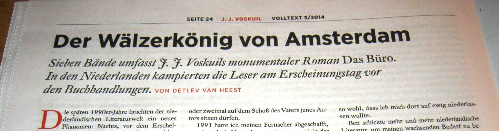 Het is de eerste keer dat ik in de Duitstalige literaire krant VOLLTEXT een artikel van een Nederlandse auteur over een Nederlandse schrijver lees. Twee pagina’s tekst n.a.v. ‘Schmutzige Hände‘, de zojuist verschenen Duitse vertaling van ‘Vuile handen’, het tweede deel van de zevendelige romancyclus Het Bureau (Das Büro) van J.J. Voskuil.